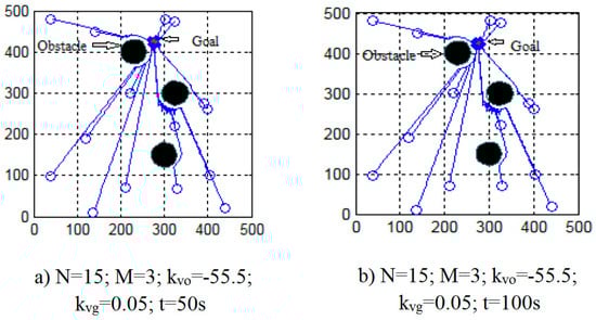 - If the number of obstacles (M) is bigger, the avoid-obstacle-coefficient ( must be more negative. If the coefficient is more negative, the ability of the robots to avoid obstacles is better, but the moving time to the destination will be longer.
