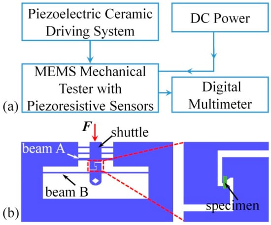 Figure 1 shows a schematic of the testing system design. Its operation control is given in Figure 1a. The system comprises an actuation system, a MEMS device, two single-system-power suppliers, and two digital multimeters (6½ digits). The two single-system-power suppliers provide a DC operating voltage for the two piezoresistive sensors. The beams on the device are driven by a piezoceramic actuator with a travel distance of 100 μm and a minimum step of 7 nm. Two digital multimeters were used to collect the sensor output voltages.