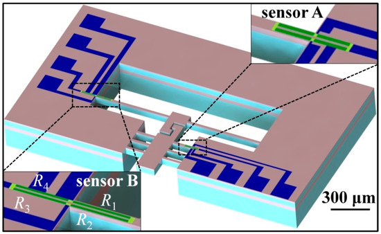 Figure 2 shows the MEMS device with two piezoresistive sensors. The overall dimensions of the device are 1.3 mm × 2.4 mm × 0.44 mm, thus they can be easily installed on the sample stage at the head of a TEM hold. Four piezoresistors indicated by green were prepared on beams A and B, as shown in the insets of Figure 2. The four sensors form a half Wheatstone bridge, to allow a precise measurement of the resistive variance. The two piezoresistors, R1 and R2, located at the roots of the beams A and B, measure the beam deflection. The resistances of the other two resistors, R3 and R4, attached to the substrate, remain constant during the beam deflection. The four resistors are electrically connected with aluminum (Al) interconnects. To improve the consistency of the process and to partially compensate the influence of temperature, the resistors on the beam and those on the substrate were placed as close as possible to each other [52]. The beams and the piezoresistors are aligned along the <110> direction on the (100) plane of a silicon wafer substrate for obtaining a better sensor sensitivity [53].
