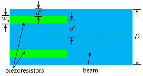where D is the beam thickness (along the force direction), wp is the width of the piezoresistor, and d″ is the distance between the outer edge of the piezoresistor and the beam. Figure 3 shows all the parameters in Equation (5).