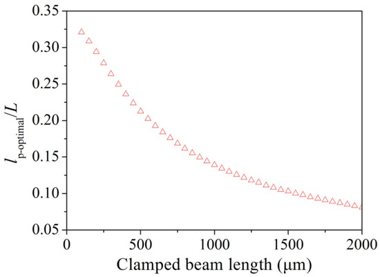 According to Equations (8) and (9), increase in the length, lp, of the piezoresistor has an opposite influence on the power density of the Hooge and Johnson noises, i.e., a decrease in the Hooge noise but an increase in the Johnson noise. It is further noted from Equation (7) that increase in lp can also lead to a loss in the displacement sensitivity. Because of the complicated effect of lp on the displacement resolution and sensitivity, the resolution was partially differentiated against lp to obtain an optimal length contributing to a high resolution. For each clamped beam length, L, an optimal lp-optimal is obtained. Figure 4 shows the evolution of lp-optimal/L as a function of the clamped beam length. The results show that the lp-optimal/L decreases with increasing L.