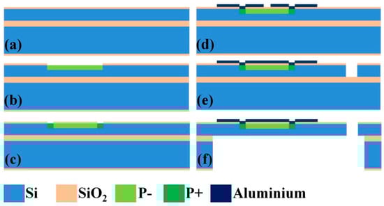 Schematic of the main steps to fabricate the MEMS device: (a) thermal oxidation; (b) p− doped; (c) p+ doped and contact hole; (d) interconnects and pads; (e) front side inductively coupled plasma (ICP); and (f) structure release.