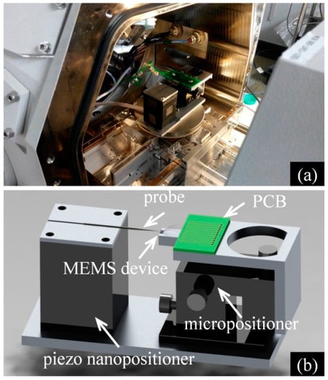 A focused ion/electron dual-beam system (FIB/SEM, FEI Helios Nanolab 600 i, FEI, Hillsboro, USA) was used to calibrate the displacement of the MEMS device in a high vacuum environment ( Pa) with a purpose of avoiding the disturbances arising from variations in temperature, humidity, electromagnetic radiation, mechanical vibration, etc. [58,59], as shown in Figure 7a. Figure 7b shows the design of the testing system setup for calibration prior to tensile testing. The MEMS device was first glued on to a custom-made printed circuit board (PCB) and then connected with the PCB by ultrasonic bonding. The PCB was then fixed onto a three-dimensional micropositioner. The shuttle beam of the device was precisely aligned with the probe fixed on the piezo nanopositioner. The piezo nanopositioner moved in a step of 7 nm to drive the shuttle through the probe, ~10 μm in diameter. For each batch of MEMS devices fabricated on the same wafer, a few MEMS devices were selected for calibration. The displacements of the beams A and B on the selected calibration device were measured from the SEM images taken. The corresponding output voltages of the displacement sensors were simultaneously measured by a digital multimeter and recorded in a computer. A sensor voltage–image displacement curve is then obtained for each of the two sensors. During testing, the displacement on the sample is read out from the sensor voltage output of the two beams (xa and xb) based on the calibration. The deformation strain is then calculated according to Equation (1) by knowing the original length (l0) of the specimen prior to testing. The force applied on the specimen (Fb) is calculated based on the displacement of beam B, as per Equation (16). The stress can then be calculated using Equation (2) by measuring the cross-sectional area (S) of the specimen prior to tensile testing.