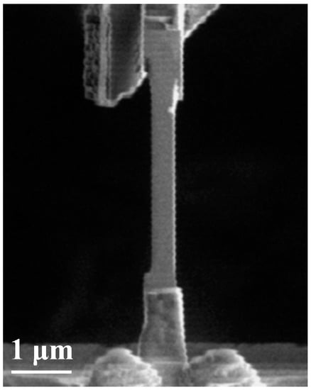 - Dongfeng, Z.; Breguet, J.M.; Clavel, R.; Sivakov, V.; Christiansen, S.; Michler, J. In situ electron microscopy mechanical testing of silicon nanowires using electrostatically actuated tensile stages. J. Microelectromech. Syst. 2010, 19, 663–674. [Google Scholar] [CrossRef]