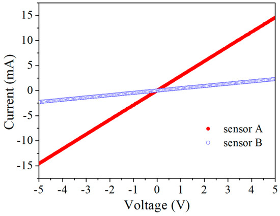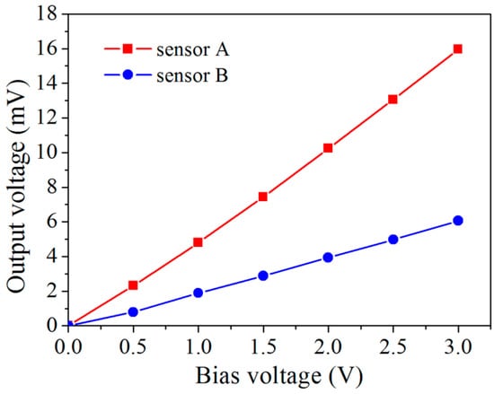 Figure 9 shows the current–voltage characteristics of the two piezoresistive sensors. It is seen that both sensors exhibited perfect linear behavior within the range of −5–5 V. This also indicates a perfect contact between the sensors and the Al interconnects. The resistances of sensors A and B are determined to be 0.34 and 2.1 kΩ, respectively. Figure 10 shows the effect of the bias voltage on the zero-point output voltage of the two sensors. It is seen that the zero-point output also has a linear dependence on the bias voltage for both sensors. The zero-point deviation can be attributed to the uneven ion implantation among the four resistors, despite identical processing conditions used. Therefore, zero setting of the bridge output voltage was conducted on each sensor before calibration.
