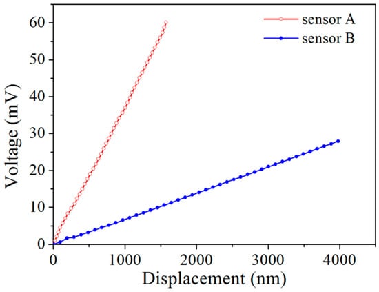 - Sensors A and B have displacement sensitivities of 37.4 μV/nm and 4.8 μV/nm.