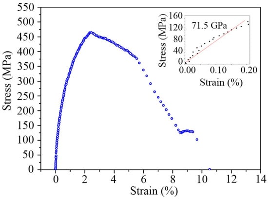 An Al thin film of 510 nm in thickness was subjected to tensile deformation on the device in the FIB/SEM system with an actuation step size of 7 nm. SEM images were taken during tensile deformation. Figure 13 shows the stress–strain curve measurement of the Al film sample. The Young’s modulus of the specimen is measured to be 71.5 GPa by linear fitting, consistent with bulk materials (68.5–71 GPa). The Young’s modulus is also consistent with the 100 nm Al film measured by the MEMS sensors [62]. The flow stress is determined to be ~460 MPa, which is low compared to ~700 MPa [62]. This may be related to the thickness and density of the film used.