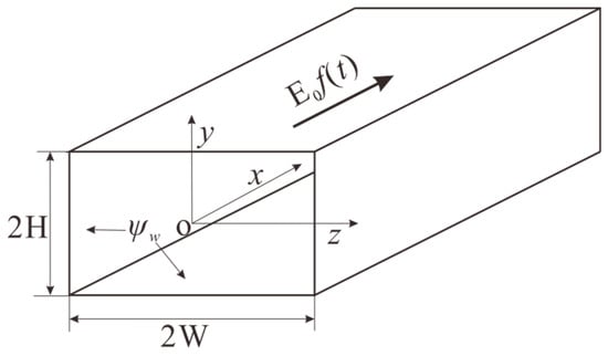 Electroosmotic flow system in a rectangular microchannel. The width of the channel is 2W and the depth of the channel is 2H. All the walls are uniformly charged with a zeta potential ψw, and the dynamic electric field E0f(t) is applied along the axial direction of the microchannel. The zeta potential on the walls induces a near-wall electric double layer (EDL) which has a non-zero charge density. Then, interaction of the external electric field with the non-zero charge density induces a driving force for electroosmosis.