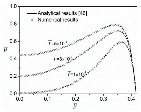 Figure 2 shows the velocity profiles at for three different time instants computed with the analytical formula [46] and our Comsol model. It can be seen from this plot that the numerical results of velocity distributions obtained from the Comsol model at three different time instants agree perfectly well with those obtained from the existing analytical model, which validates the high robustness and accuracy of the Comsol model.