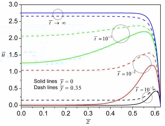 Figure 3 shows electroosmotic velocity profiles of a power-law fluid with n = 0.8 at different time instants. Initially, the liquid in the whole microchannel is quiescent (not shown in Figure 3). As soon as the electric field is applied, the liquid within the EDL starts to flow immediately, but the bulk liquid in the middle portion of microchannel remains stationary. As the dimensionless time evolves to 10−3, at , the velocity reaches a local maximum near the vertical side wall (inside the EDL of side wall), and then drops gradually to zero as the distance is away from the side wall. At (very near the top wall), there is similarly a local maximal velocity near the side wall. However, the liquid far from the vertical side wall in this case is already in motion because of the EDL of the top wall. Moreover, the maximal velocity at is higher than that at . This is because at near the vertical side wall (around the right upper corner of channel cross-section), the liquid is actuated by the electrostatic body force due to EDLs on both the top and side walls; while at near the vertical side wall, the liquid is actuated by the electrostatic body force due to the EDL on the side wall alone. In electroosmotic flows, the driving force is only present in the EDL region, and the generation of momentum is then also limited in the EDL region. As time evolves, the fluid velocity within the EDL continues to increase; at the same time, the bulk fluid starts moving due to the gradual transfer of momentum from the EDL to bulk liquid (see velocity profiles at and ). When the flow develops to the steady state (), the velocity distribution exhibits a plug-like profile. It is also observed that the velocity profile at develops faster than that at , which is peculiar to rectangular channels. This effect can be ascribed to the fact that at the driving force is present along the entire axis, while at the driving force is present only near the vertical side wall.