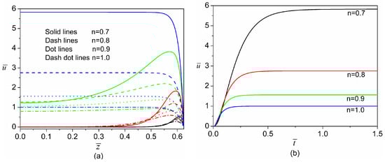 Usually, the fluid behavior index (n) is varied by the addition of polymers into the solutions which also changes the value of zeta potential. This indicates that the zeta potential is practically a function of n. However, at present, the quantitative relation between zeta potential and n is unclear and remains to be investigated. Therefore, for convenience, the zeta potential is assumed to be an independent variable which is not influenced by n in the current study. Such an assumption is widely adopted in the literature for study of electroosmotic flow of non-Newtonian fluids [27,28,29,30,31,32,33,34,35,36,37]. Figure 4 characterizes the transient development of electroosmosis of power-law fluids with different fluid behavior indices. The velocity in the whole channel domain is zero at t = 0 for all values of the fluid behavior index (not shown in Figure 4). As shown in Figure 4a, when dimensionless time evolves to 10−3, the fluids with smaller fluid behavior indices acquire higher velocities inside the EDL region near the channel wall. The velocity inside the EDL becomes higher as time evolves, and at the same time the momentum generated inside the EDL gradually diffuses to the bulk. At , the fluids with smaller fluid behavior indices still have higher velocities inside the EDL region, while outside the EDL the velocity for a larger fluid behavior index surpasses that for a smaller fluid behavior index. This feature indicates that the momentum transfer is faster for a larger fluid behavior index due to the stronger viscous coupling between the EDL and the bulk liquid. At the steady state (), normalized velocities in the bulk flow for four fluid behavior indices all increase to their corresponding constant values, which are typical for electroosmotically-driven flows. Furthermore, at the steady state, the velocity profiles for smaller fluid behavior indices become more plug-like and also the magnitude of bulk velocity is larger for a smaller fluid behavior index. As is the case for n = 0.7, the steady sate bulk liquid velocity is more than five times higher than that of Newtonian fluids (n = 1), which implies that the electroosmotic pumping of shearing-thinning fluids is far more efficient than that of Newtonian fluids. For situations where we have large-sized channels or thin EDLs (i.e.,), it can be expected that the power-law fluid in the entire microchannel moves with a uniform bulk velocity. Consequently, the constant bulk velocities for various values of flow behavior index can be effectively seen as the so-called Helmholtz–Smoluchowski velocities in electrokinetics of power-law fluids (i.e., electrophoresis of particles in power-law fluids and electroosmosis of power-law fluids). In addition, it is shown in Figure 4b that the fluids with larger fluid behavior indices approach the steady state more quickly. This is because the fluids with larger fluid behavior indices are more viscous and then the momentum generated inside the EDL can be transferred more promptly to the center portion of the channel.
