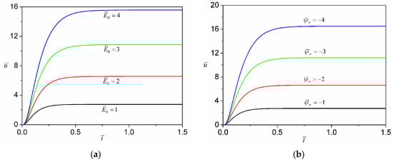 (a) Comparison of transient development of the axial velocity at the transverse center () under different magnitudes of external electric field strength when n = 0.8 and ; (b) Comparison of transient development of the axial velocity at the transverse center () for different magnitudes of zeta potential when n = 0.8 and .