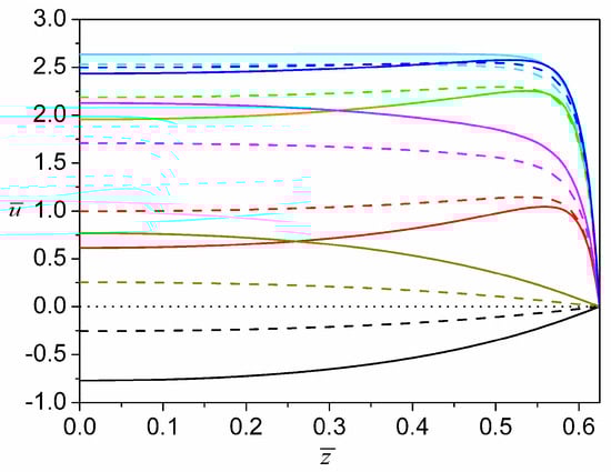 Steady-state oscillating axial velocity profiles of a power-law fluid with n = 0.8 at different phases in a half period from to when , and . There are seven groups of velocity profiles differentiated by different colors and each group represents the profiles at a given AC phase. In each group, the solid line is the velocity profile at and the dash line is the profile at . The group with black color represents the profiles at ; the group with red color represents the profiles at ; the group with green color represents the profiles at ; the group with blue color represents the profiles at ; the group with cyan color represents the profiles at ; the group with magenta color represents the profiles at and the group with dark-yellow color represents the profiles at . On the straight dot line, .
