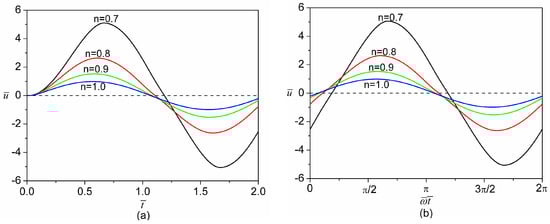 Figure 7 presents the comparison of transient velocity development for different values of fluid behavior index at both the start-up stage and the steady-state oscillation. After turning on the AC electric field at , it is seen from Figure 7a that the fluid at the transverse center () remains quiescent for a very short period of time. At this moment, the momentum generated inside the EDL is still limited to the regions near the channel walls and therefore needs time to diffuse to the bulk liquid. After a certain amount of time, the momentum is gradually transferred to the bulk liquid and then the liquid starts to move. The fluid with a larger fluid behavior index responds more promptly to the applied AC field and then reaches the peak velocity more quickly. This is consistent with the case of the DC electric field in which the fluid with a larger fluid behavior index reaches the steady state more quickly. When the flow attains the steady-state oscillation (Figure 7b), the velocity generally lags behind the applied AC electric field, and the phase lag increases with the decrease of fluid behavior index, as is indicated in Figure 7c. We also note from Figure 7b that from one peak to its corresponding trough, power-law fluids with a smaller fluid behavior index experience more significant acceleration. Furthermore, the amplitude of oscillating velocity increases as the fluid behavior index decreases.