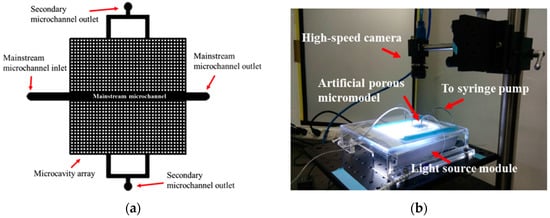 The artificial porous micromodel design is shown in Figure 1. To mimic a natural fractured porous material, the micromodel device comprises a 2.6-mm-wide and 50-mm-long microchannel (mainstream microchannel) in the middle of a uniform 30 mm × 30 mm pore pattern containing 1332 pieces of microcavities. Each microcavity was 500 μm in diameter and 100 μm in depth. The microcavities were separated by a 200-μm distance (see Figure 1a).