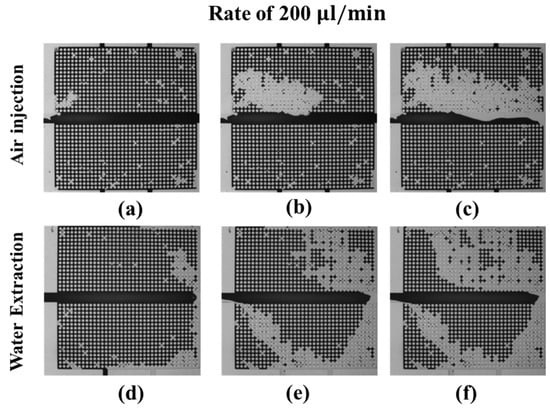 Dynamics of the water (dark)–air (transparent) distributions during the drainage process with an air-injection (a–c) and a water-extraction (d–f) rate of 100 μL/min; (a,d) correspond to the beginning, (b,e) to the middle, and (c,f) to the end of the drainage process.