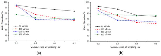 Figure 9 shows the evolution of water saturation versus the volume ratio of the injected air, which is the ratio of the total injected air volume to the total pore volume of the micromodel. Because during the water extraction, air also moves out of the micromodel via the inlet, the amount of water extracted cannot be estimated only from the extraction rate of the syringe pump. Nevertheless, we can estimate the injected-air volume during the water-extraction experiments. Therefore, we use the volume ratio of the injected air for all experiments, as shown in Figure 9. For air injection, the water-saturation-decreasing rate increases with the air-injection rate. At injection rates higher than 100 μL/min, the residual-water saturations all converge to approximately 70%. For water extraction, the water-saturation-decreasing rate increases with the air-injection rate. Nevertheless, at the extraction rate of 400 μL/min, the water distribution reaches an equilibrium quickly, with water saturation of approximately 80%. This is because the preferential air path is readily formed at the beginning of the experiments.