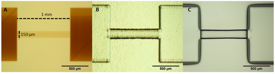 Microscopic images of: (A) Z-shaped channel filled with SU-8 photoresist dissolved in acetone and prebaked for 20 h; (B) sinusoidal shaped ridges written by TPP, in developing solution; and (C) sinusoidal shaped ridges after developing and drying, Reproduced from [86].