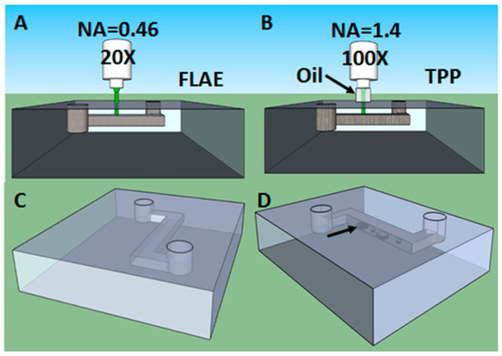 Combining advantages and compensating drawbacks of both subtractive and additive processes, a new concept of hybrid 3D processing was proposed to create 3D micro- and nanostructures with more complicated shapes and increased functionalities. Specifically, after the 3D channel fabrication by FLAE (Figure 2A,C), the fabricated channel is filled with an epoxy negative-tone photoresist with good mechanical, chemical and biological properties. TPP process is then carried out in order to create polymeric structures inside the channels (Figure 2B,D). In order to increase the resolution, an oil immersion objective lens with higher numerical aperture is used for TPP. The hybrid process allows lowering the size inside the glass microchannels due to much higher fabrication resolution of TPP than FLAE. It offers in the same time to maintain the transparency for optical interrogation as well as robustness for fabrication of a concrete device.