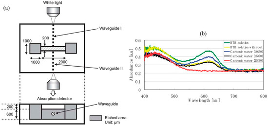(a) Schematic of the microfluidic chip integrated with optical waveguides. White light for absorption measurements is transmitted by waveguide I to cross the microfluidic channel filled with liquid samples and is then coupled into optical waveguide II to be introduced to the detector; (b) Optical absorption spectra of liquid samples filling the microfluidic channel: water containing an aqueous bromothymol blue solution (green line), with a seedling root (yellow line), and with carbonic water with different CO2 concentrations [50].