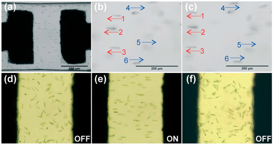 Electroorientation of Euglena in microfluidic channel: (a) Overview of oriented Euglena cells between a pair of microelectrodes (black parts) in a channel when applying an AC voltage. (b,c) Oriented Euglena cells swimming bidirectionally at different times. Movement of Euglena in the microchannel: (d) before applying the electric field; (e) with electric field; and (f) when the electric field was turned off. Reproduced from [56].