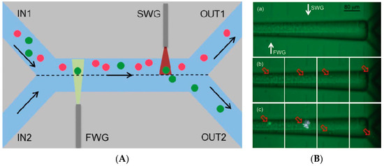 (A) Schematic and cell sorting principle where green particles are fluorescent: FWG: “fluorescence waveguide” excitation of cells fluorescence; SWG: “sorting waveguide” used for optical force in sorting process. (B) (a) Image during operation; (b) sequence of frames during fluorescence activation with non-fluorescent cells; and (c) with fluorescent cells. Reproduced with permission from [63].