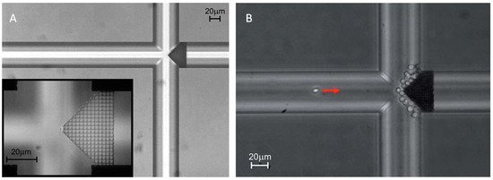 (A) Image of the filter inside the microfluidic chip between two channels. Inset shows the filter at a higher magnification. (B) Blood cells filtered from diluted blood. Reproduced with permission from [68].
