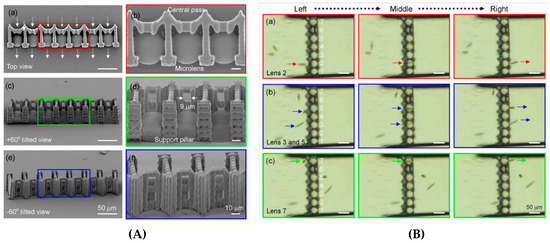 (A) TPP fabrication of a center-pass combined microlens array on a flat glass surface. The 9-μm aperture size is slightly larger than the 6–8 μm cells diameter. Fifteen-micrometer-width support pillars were fabricated to increase stability. (B) Center-pass function of the optofluidic device to control the Euglena cell position: cell passing above lens 2 and reaching right side of the device (a); and cells passing above lenses 3, 5, and 7, from left to right (b,c). Reproduced from [84].