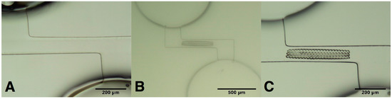 There are, however, some issues related to the stability of photopolymerized structures, especially when they are fabricated with the highest resolution (finer features) for applications such as micro to nano-photonics and microfluidics. The stability problems are due to polymer shrinkages, deformations and collapsing after developing. In order to avoid these issues in biochip applications, in most cases, TPP was used to fabricate 3D microstructures in open glass microfluidic channels prepared by other techniques in advance (Figure 7) [67].