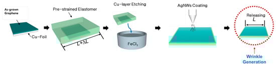 The fabrication process of the graphene and silver nanowire hybrid electrode with a wrinkled structure is illustrated in Figure 1. In this process, the wrinkled structure of the elastomer surface was formed mainly due to the difference in modulus between the elastomer film and the graphene and silver nanowire electrode.