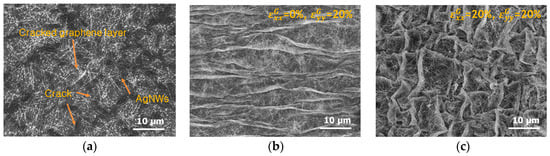 SEM images of the graphene–AgNWs hybrid electrode: (a) flat surface morphology, (b) uniaxially compressive strain of 20% and (c) biaxially compressive strain of 20%.