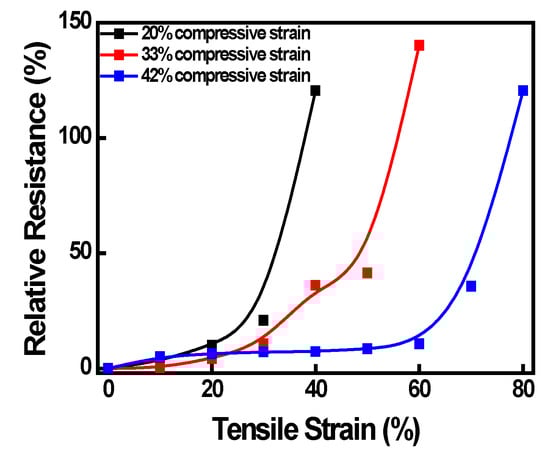 The relative resistance of the electrodes was examined in order to investigate the influence of the wrinkling morphology. Three types of specimens with different compressive strain values were prepared for this experiment. The compressive strain values applied to the specimens were 20%, 33% and 42%, respectively. As shown in Figure 4, the relative resistance (ΔR/R0) remains stable in the initial section, and as the strain value is increased, the magnitude of the relative resistance value is changed sharply. These results can be explained based on the wrinkled structure of the electrode. As shown in Figure 3, when the value of the tensile strain is increased, the hybrid electrode material, that is, the connectivity between the graphene and the silver nanowires, is weakened. For this reason, it can be understood that the resistance increases sharply in the section where there are fewer wrinkled structures.
