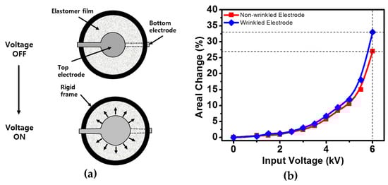 In order to verify the operating performance of the actuator, we connected the electrode of the actuator to a DC high voltage supply capable of generating 0–10 kV. Then, the applied voltage was gradually increased from 0 to 6 kV, and the change in the area of the actuator was examined. For more precise performance analysis, it is essential to determine the area of the increased actuator under electrical stimuli. For this purpose, the moving images of the actuator were captured frame-by-frame, and analyzed using an image processing program. The actuation of conventional dielectric elastomer actuators using a high input-voltage caused the electrodes to expand with an isotropic areal strain as shown in Figure 5a. Isotropic behaviors of the dielectric elastomer actuator can be differently realized by the morphological configuration of hybrid electrodes. Figure 5b shows the experimental results to confirm the performance difference of the wrinkled and wrinkle-free electrodes when electrical input voltages are applied to two dielectric elastomer actuators. The actuator sample with wrinkled electrodes shows an areal change (ΔA/A0) of 33%. Within 4 kV, the areal change of the actuator is almost similar in both cases, but there is a remarkable maximum difference of about 6% at 6 kV.