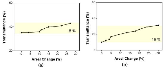 Using the same method as that used for the wrinkle-free sample, the change in active area of the dielectric elastomer actuator with wrinkled graphene–AgNWs hybrid electrodes was measured with respect to the applied voltages. Then, the transmittance change according to area changes was also examined. The wrinkled electrode structure exhibited about a 33% change in area ratio, and a transmittance change of about 15%. That is, although the wrinkled structure showed the same area change rate, it can be confirmed that the transmittance was about twice as large as that in the case of the wrinkle-free sample. When compared with the structure without wrinkles, the cause of this phenomenon is understood to be the difference in transmittance due to the scattering of light.