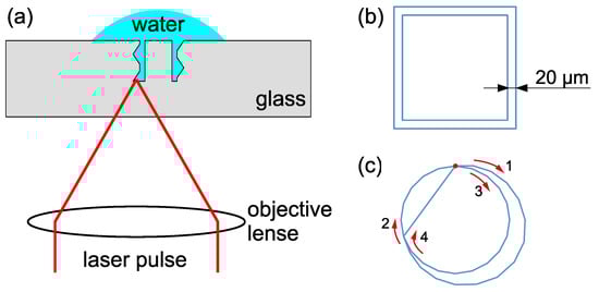 - An, R.; Li, Y.; Dou, Y.; Liu, D.; Yang, H.; Gong, Q. Water-assisted drilling of microfluidic chambers inside silica glass with femtosecond laser pulses. Appl. Phys. A 2006, 83, 27–29. [Google Scholar] [CrossRef]