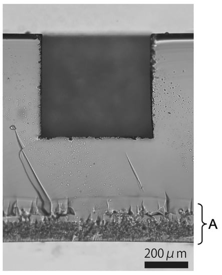 Sectional view of a fabricated hole with square cross-section. “A” indicates the region where laser-induced internal transformation was applied for cleaving.