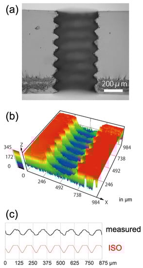 Next, we fabricated a miniature internal thread of S0.5 (major diameter of 0.5 mm) through the glass substrate. The pulse energy, repetition rate, and translation speed were the same as those for the hole with a square cross-section. The trajectory of the laser focus was as shown in Figure 1c. The focus was at first moved along the outer-most layer, which consists of the groove (1); and the ridge (2); then, it was moved along the minor diameter circle (3); and finally moved to the original position (4). Fabrication of one thread took about 32 min. Figure 3 shows the images of the inner surface of the fabricated thread after cleaving. Figure 3a is the sectional view. We can see a spiral pattern of the thread. Figure 3b is a pseudo-color oblique view measured with laser-scanning microscopy. This image clearly shows that ridges and grooves were recorded on the inner surface. The cross-sectional profile and its comparison to that of the ISO is shown in Figure 3c. The pitch of the fabricated thread reasonably agreed with the ISO standard (0.125 mm), while some chipping (small cracks) was observed.