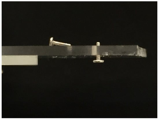 In order to examine the functionality of the fabricated internal thread, a commercial S0.5 male screw (Matsumoto Industry, Abiko, Japan) was fitted to it. The photo is shown in Figure 4. As seen, the male screw was well fitted through the hole, and remained in the hole against the force of gravity.
