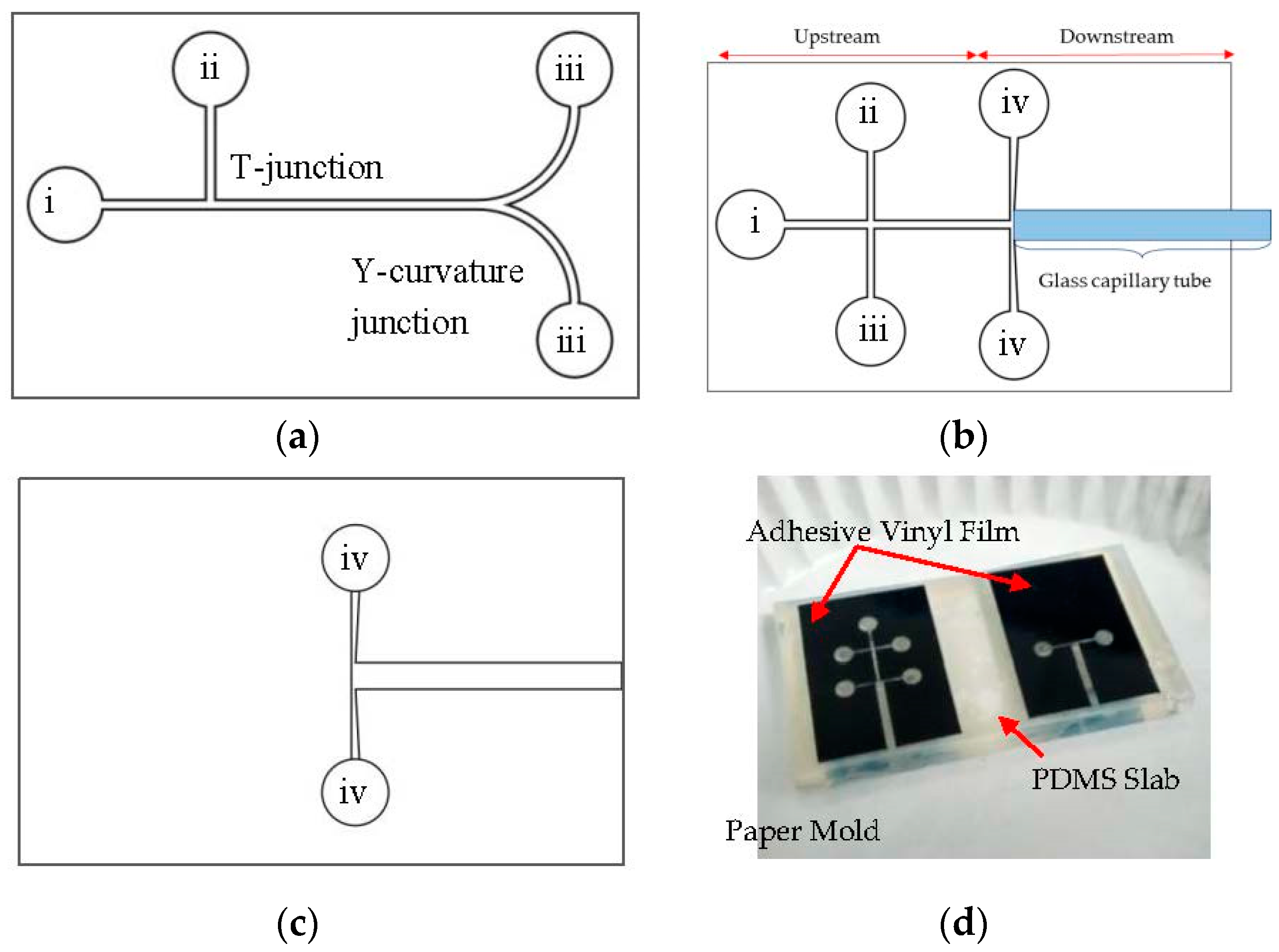The modified xurography process started with a drawing of the microchannel design features (Figure 1a–c) using conventional drawing software. The design was then sent to the cutting plotter (CE6000-60, Graphtec, Yokohama, Japan) to be plotted onto 100 μm thickness adhesive vinyl film (Oracal Intermediate Cal 651, Orafol, Oranienburg, Germany). The vinyl film was then transferred to a blank PDMS slab which was later adhered onto a paper mold (Figure 1d). The epoxy resin and hardener (CP362 A/B, Oriental Option Sdn Bhd, Penang, Malaysia) were prepared at a ratio of 2:1 (w/w) and poured into the paper mold to be cured overnight at the room temperature (25 °C). PDMS pre-polymer (Sylgard 184, Dow Corning, Midland, MI, USA) prepared at a ratio of 10:1 (w/w) were poured into the master mold and left partial curing. The partially cured PDMS slabs were peeled from the master, aligned and sealed via a custom-made PDMS aligner. The double layer aligned PDMS layers was then heated for 2 h at 80 °C to complete.