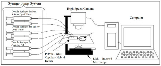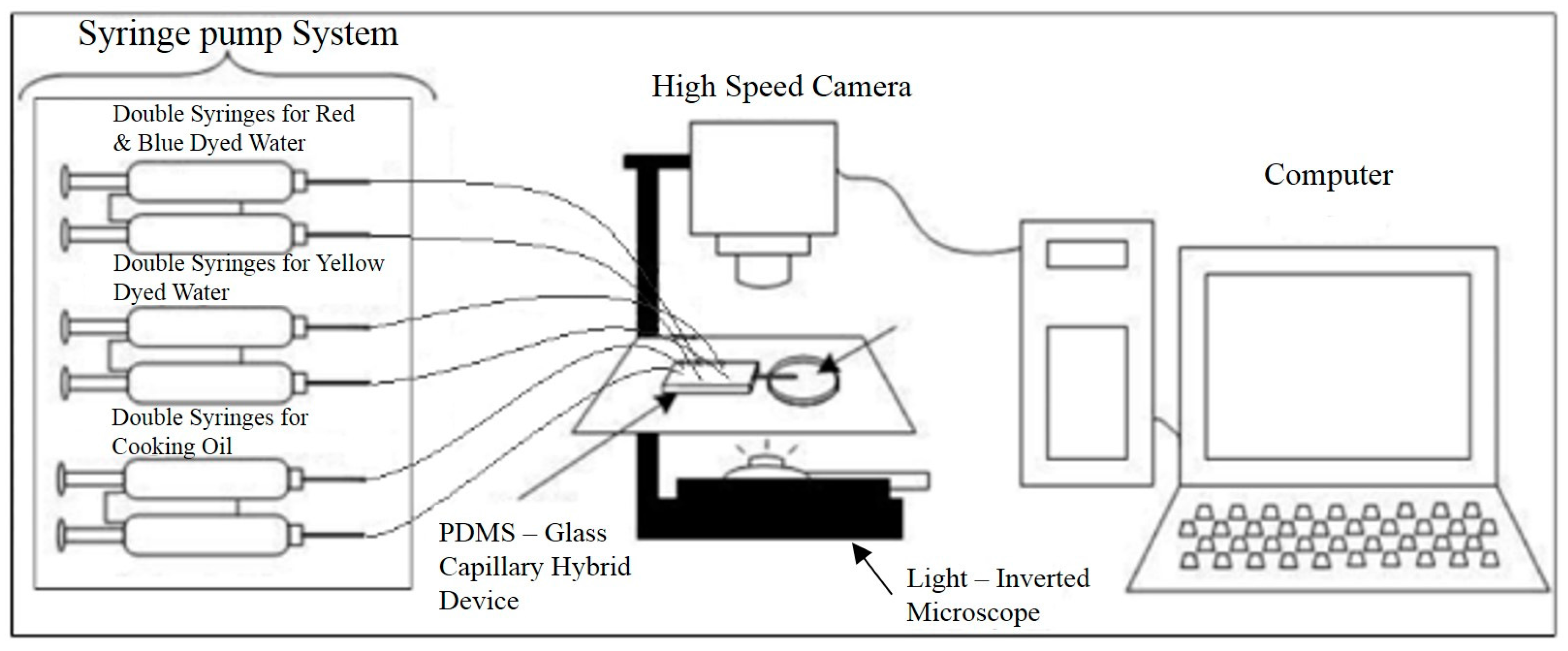 All the aforementioned liquids were loaded individually into their respective inlets through polytetrafluoroethylene (PTFE) tubing with an outer diameter of 1/16” (Omnifit® Labware, Diba Industries Ltd., Cambridge, UK), delivered by syringe pumps (Model KDS-200, KD Scientific Inc., Holliston, MA, USA and NE-4000, New Era Pump Systems Inc., Farmingdale, NY, USA). The process of the droplet manipulation was recorded by a high-speed camera (Phantom Miro M110, Vision Research, Wayne, NJ, USA) mounted onto a light inverted microscope (Olympus IX51, Olympus Corporation, Tokyo, Japan) which was connected to a desktop (Figure 2). The droplet images were then extracted from the videos for a size distribution analysis via an image processing software—ImageJ (1.50i, National Institutes of Health, Bethesda, MD, USA). Experiments were repeated at least 3 times for the result accuracy purpose.