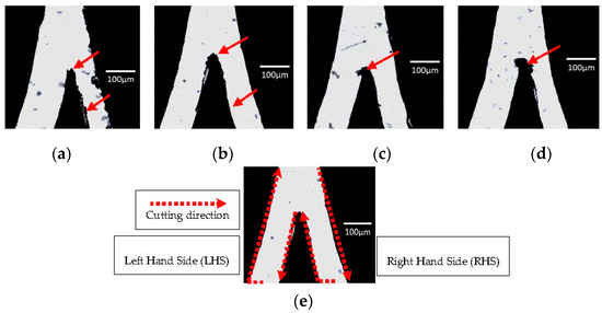(a) Undercut vinyl film at the cutting force of 5; (b) vinyl film with the optimal cutting force of 12; (c) overcut vinyl film at the cutting force of 13; and (d) overcut vinyl film at the cutting force of 20, where the red arrows indicate the locations to be noticed on the sharpness of the cutting edge and the microchannel smoothness; and (e) the moving direction of the cutter blade when producing a microchannel.