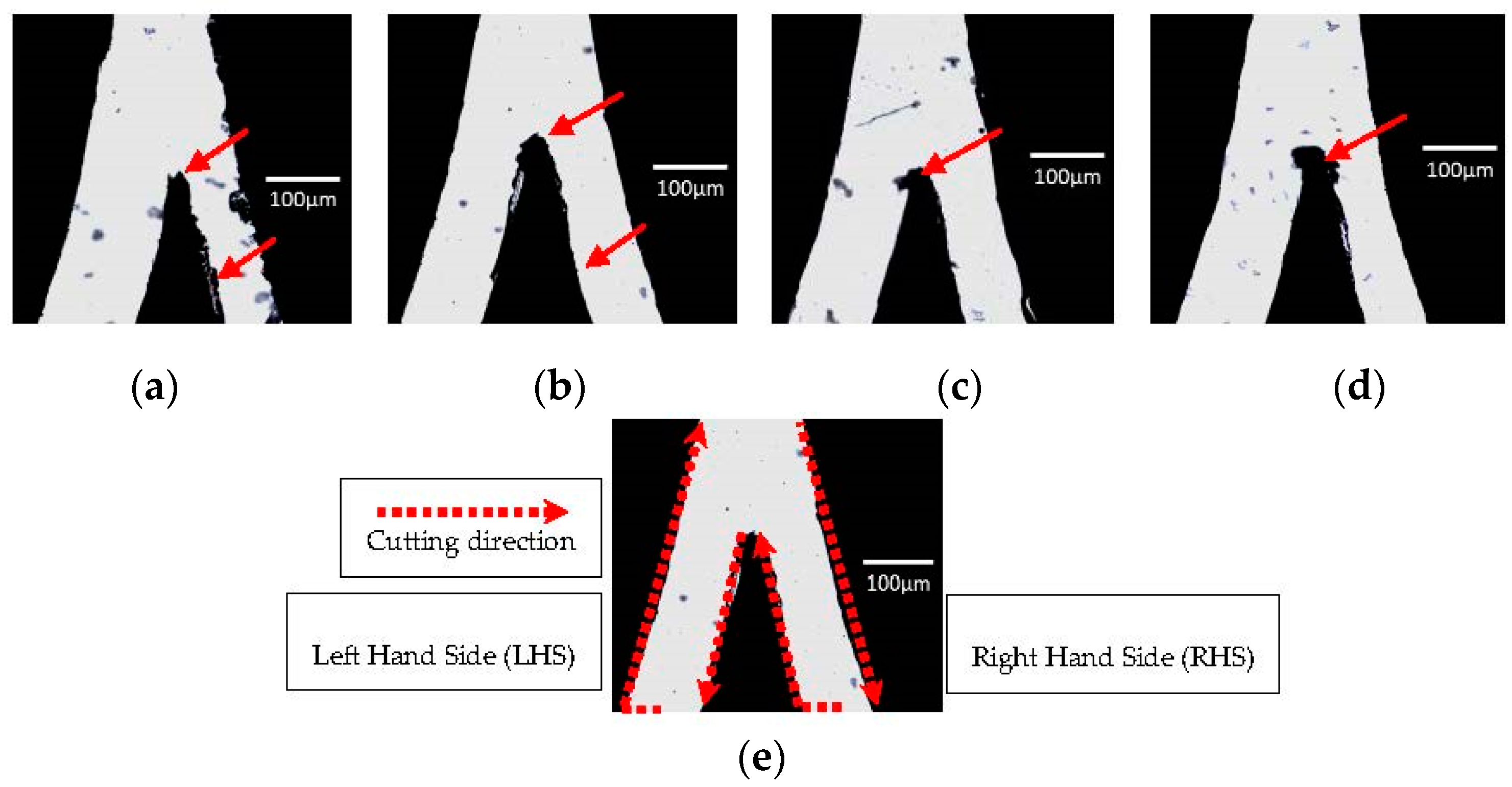 As the offset values were set towards the negative value, the centerline moved backwards to the tip of the blade. As a result, the blade turned after the desired cutting path causing a narrower channel with a closed orifice. On the other hand, while the offset value increased towards the positive value, the centerline moved further from the tip of the blade to its front resulting in the blade to turn before reaching the desired cutting path. This caused a wider channel and rounded corner. At the optimal offset value 0, the channel widths produced were close to the desired cutting dimension with acceptable percentage errors below 5%, i.e., 3.25%, 4.75% and 3.5% for the inlet, top and bottom channel respectively. These results show better consistency as compared to the experiments at the channel width of 200 μm reported in [28]. Although we notice an exception at the orifice in which the percentage error goes up to 13.7%, it is still the lowest as compared with the other offset values where the range of errors falls within 13%–65%. It is worth mentioning that sharp edged cutting was also well observed at the optimal offset value (Figure 4b).