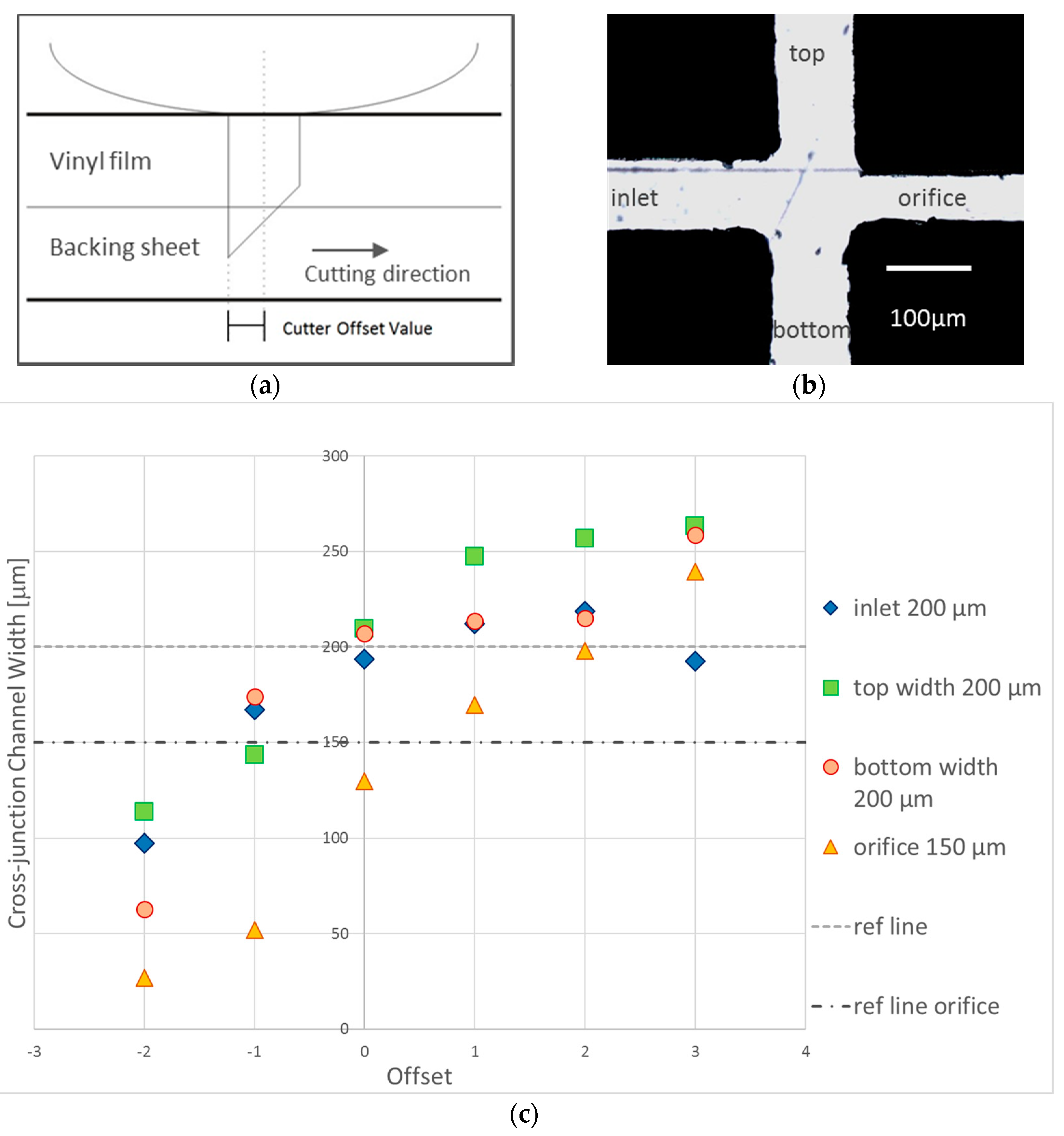 (a) Schematic illustration of the cutting mechanism of the cutter plotter; (b) vinyl film cutting at the optimal offset value 0; and (c) graph of cutting plotter offset versus cross-junction channel width. The reference (ref.) line refers to the desired width for the top, bottom and inlet channel i.e., 200 μm while the orifice width is at 150 μm. At the offset of 0 value, the errors of the channel widths produced towards the desired were below the 5% acceptable range.