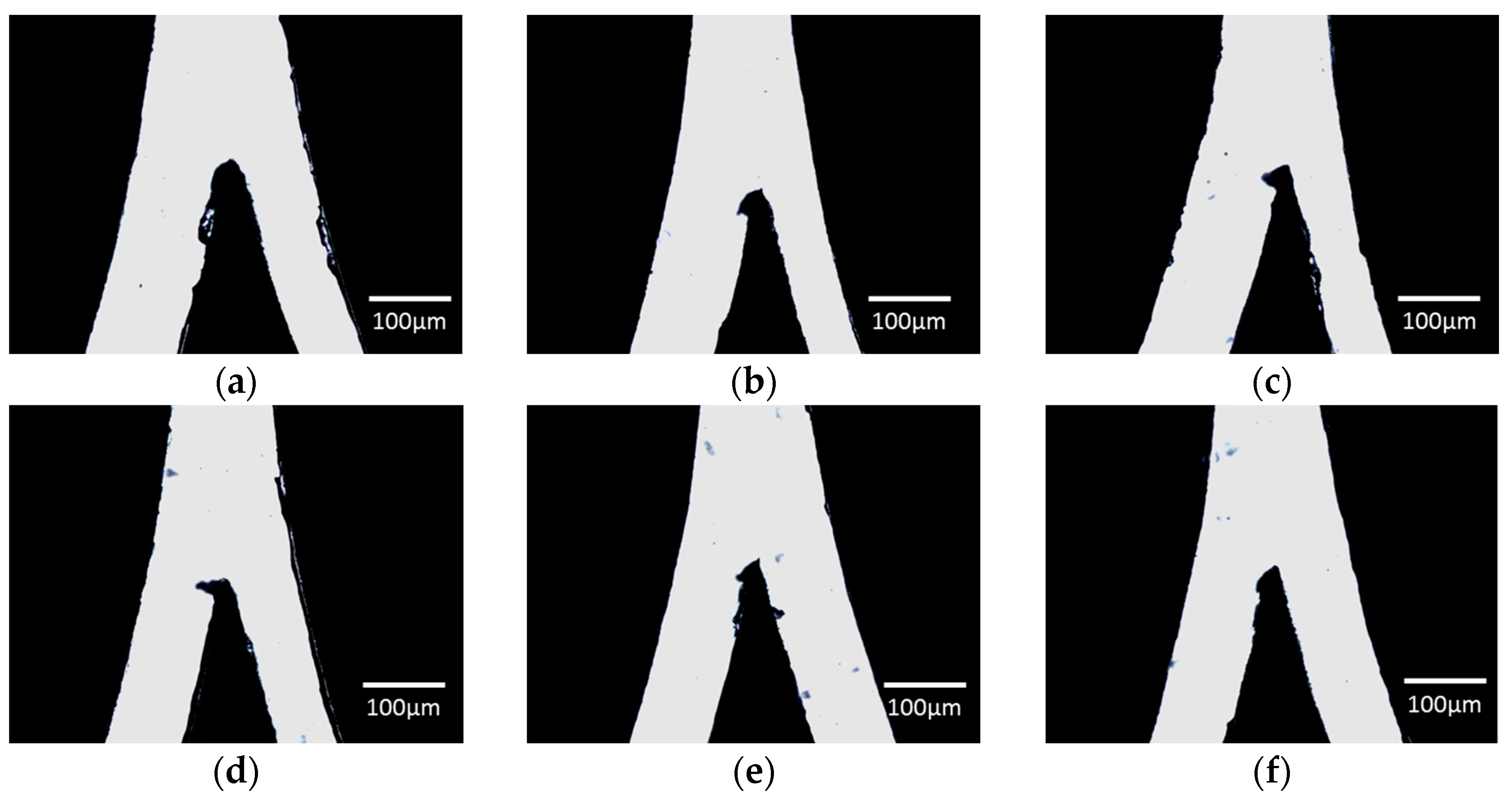 (a) Vinyl film cutting at the offset angle of 10°; (b) vinyl film cutting at the offset angle of 20°; (c) vinyl film cutting at the offset angle of 30°; (d) vinyl film cutting at the offset angle of 40°; (e) vinyl film cutting at the offset angle of 50°; and (f) vinyl film cutting at the offset angle of 60°.