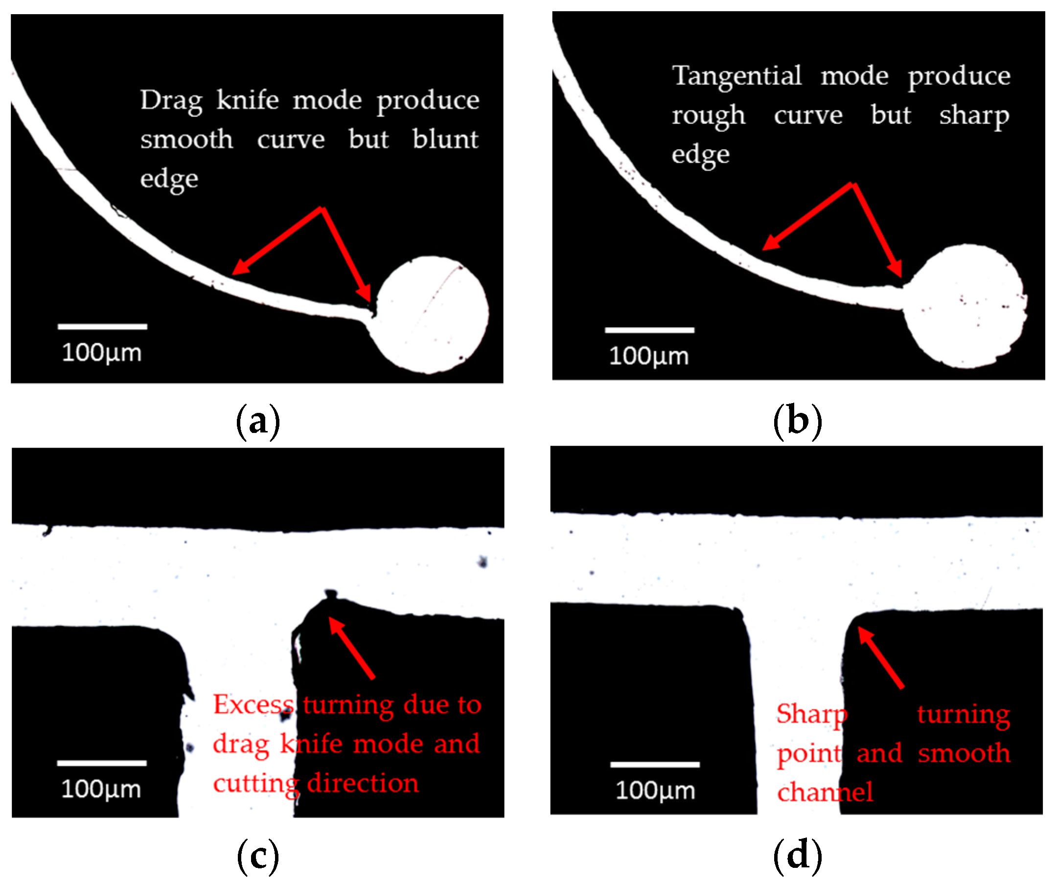 (a) Smooth channel curvature cut by the drag-knife mode. A clean cut near reservoir is harder to achieve in comparison to the tangential mode. (b) Rough channel curvature cut by the tangential mode with a cutting profile made of several straight lines with different angles. (c) Vinyl film with curvature at the corner by the drag-knife cutting even at the optimal offset value. (d) Clear edge cutting of the T-junction geometry by the tangential cutting.