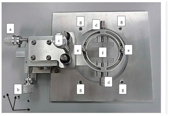 Image of the portable polydimethylsiloxane (PDMS) aligner with its functional knots that allow the PDMS layer to be moved in micro-meter (µm) intervals along the x, y, and z directions. (Labels: a. Left-right knot for PDMS slab’s left-right adjustment along the x-coordinates; b. Up-down knot to move PDMS slab’s up and down with micrometer intervals along the y-coordinates; c. Top-bottom knot to lower down the top layer of PDMS slab towards the bottom layer of PDMS slab along the z-coordinates and finally seal them together; d. PDMS-clip tightened knot for PDMS clip’s position adjustment; e. Skew adjustment knot to rotate PDMS slab in the x-z plane; f. PDMS clip to secure the position of the PDMS slab; and g. Screw hole to temporarily secure the device on the microscopic stage).