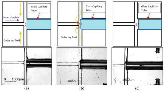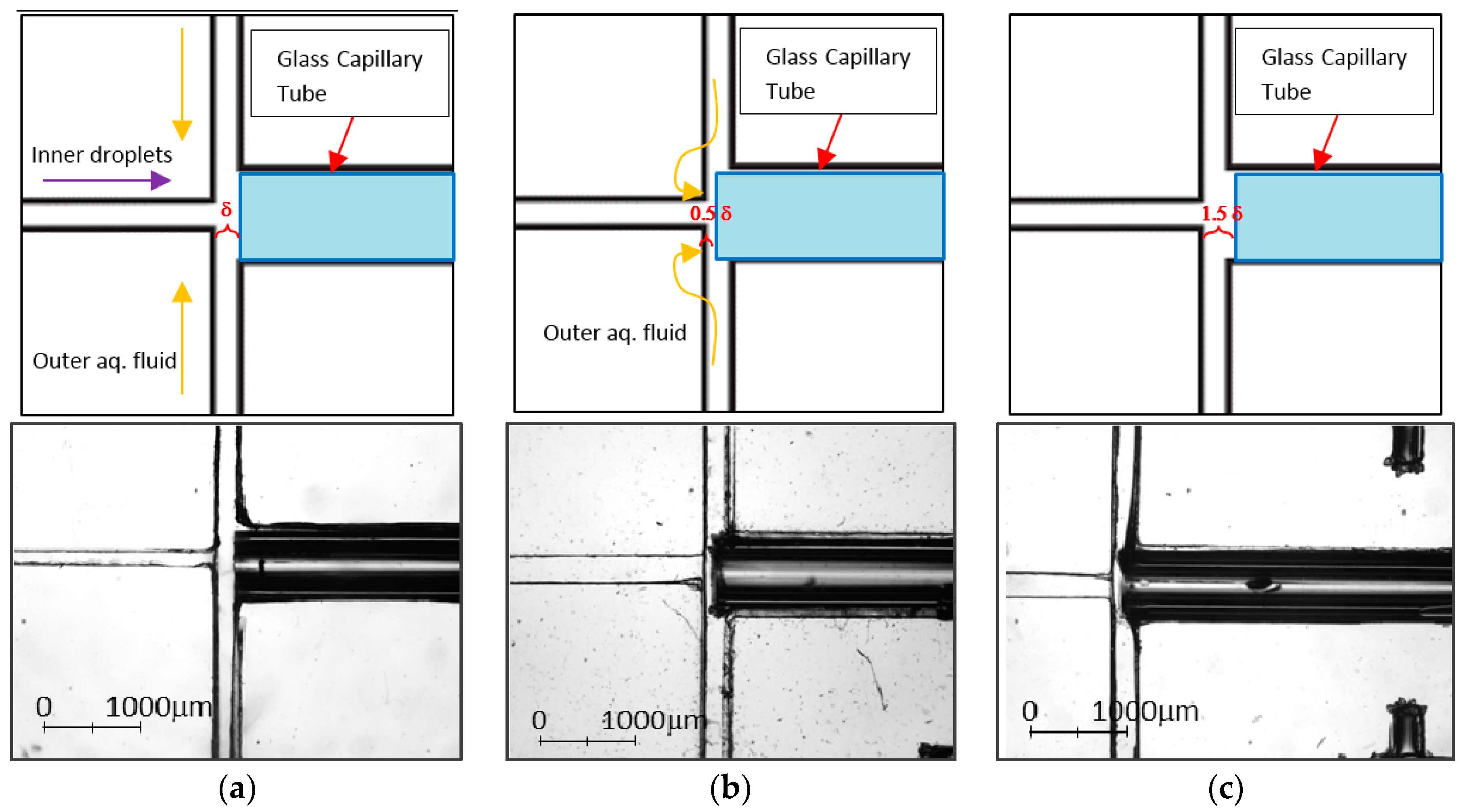 (a) Schematic illustration and the microscopic image of the glass capillary tube positioned at δ; (b) schematic illustration and the microscopic image of the glass capillary tube positioned at 0.5δ; and (c) schematic illustration and the microscopic image of the glass capillary tube positioned at 1.5δ. The glass capillary tube in the microscopic image dislocated due to expansion after heating. In the schematic diagram, yellow arrows indicate the flow of the outer aqueous phase according to different positions of the glass capillary tube while the purple arrow indicates the flow of the inner droplets.