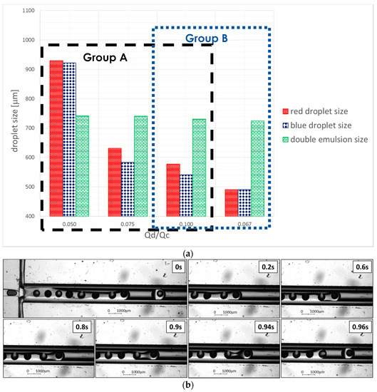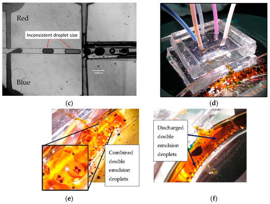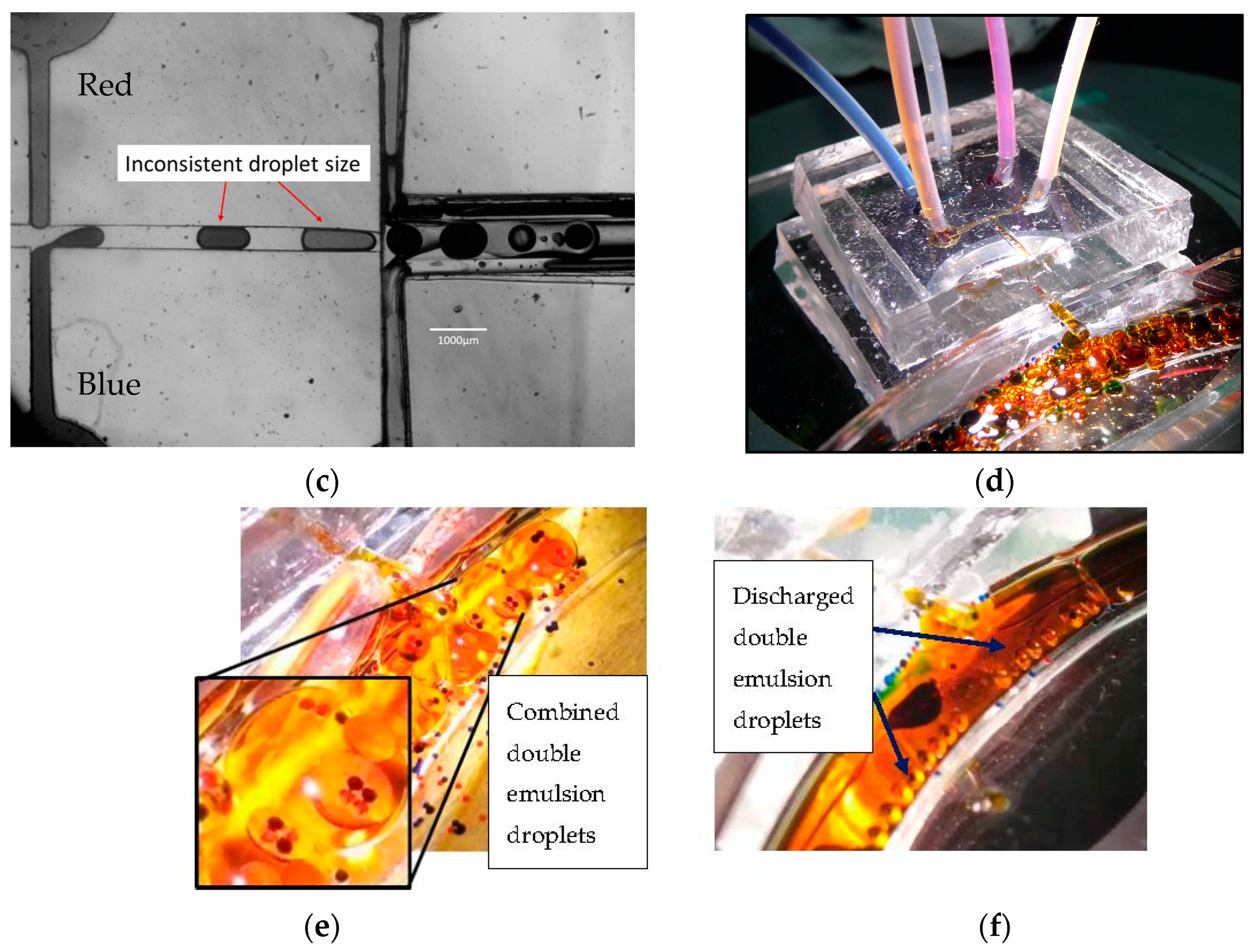 Since the droplet generation at flowrate ratio 1:2:40 µL/min falls under the transient regime, the dynamics of droplets break up would be dominated by both the shear force and interfacial force [29]. However, as Cac in these cases are very close to the squeezing regime, i.e., 0.003, the disproportion in both dominant forces i.e., shearing from the continuous phase and pressure built up across the inner droplets, causes the inconsistency of the internal droplet sizes (Figure 10c) with high values of CV i.e., 17.3% and 20.1% for red and blue droplets, respectively. From the experimental observations, a long water plug was formed when interfacial force dominated over the shear force and vice versa. Hence, this results in the formation of polydispersed internal droplets at the upstream of the device.