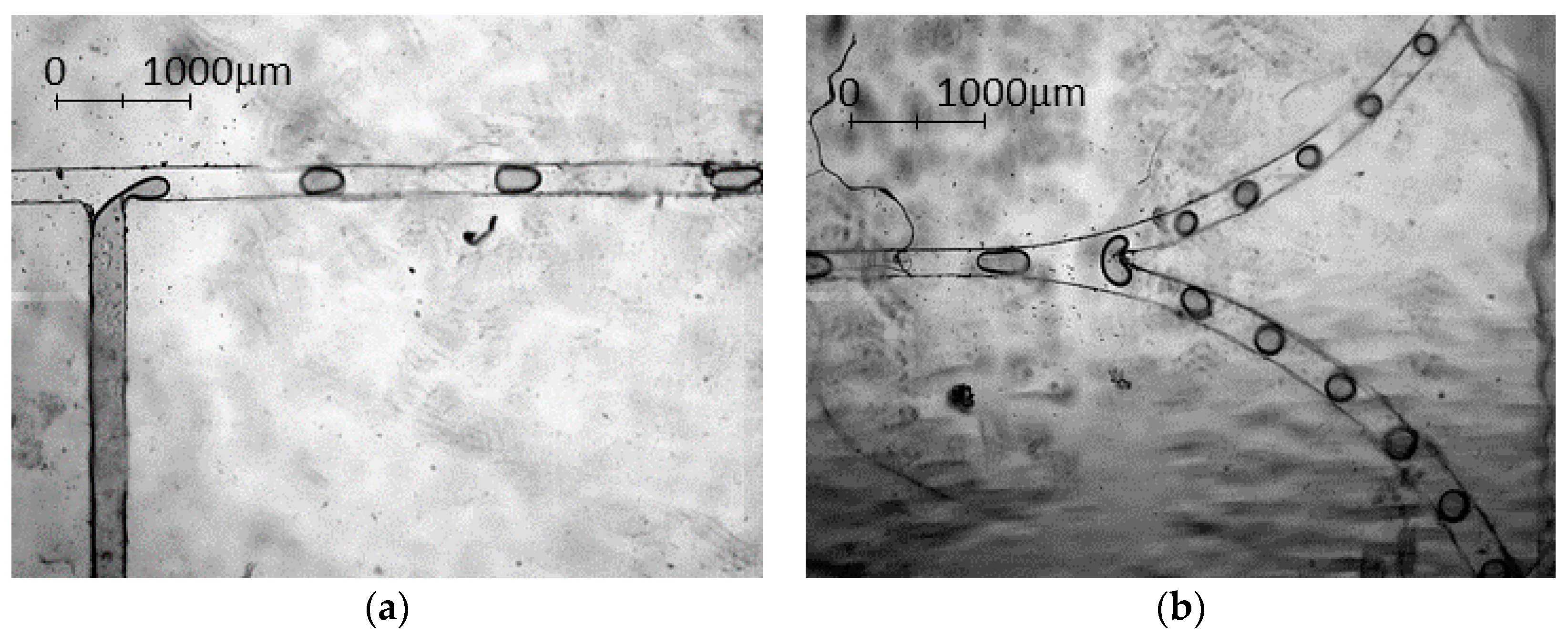 - Garstecki, P.; Fuerstman, M.J.; Stone, H.A.; Whitesides, G.M. Formation of droplets and bubbles in a microfluidic T-junction-scaling and mechanism of break-up. Lab Chip 2006, 6, 437–446. [Google Scholar] [CrossRef] [PubMed]