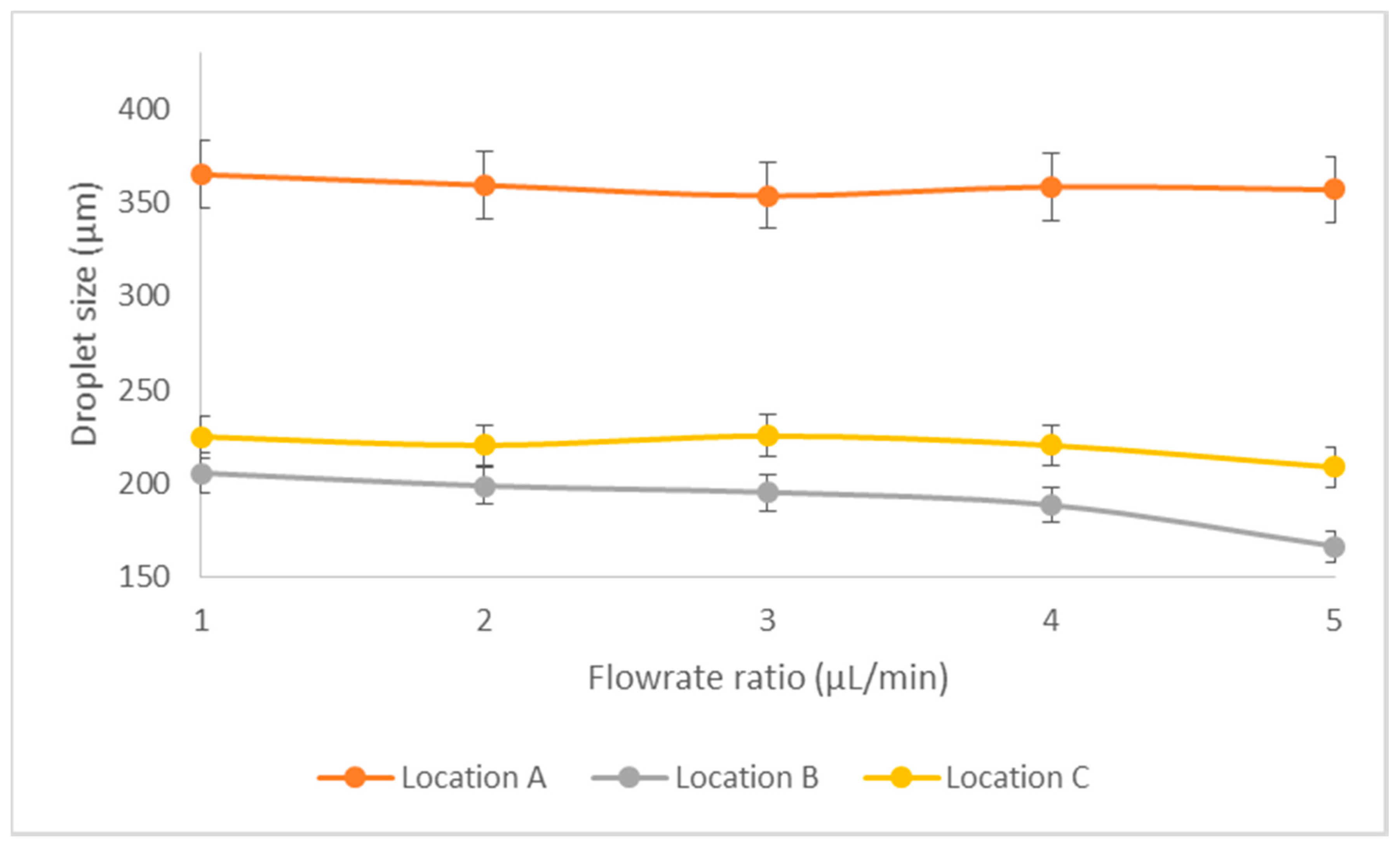 The precision of the PDMS aligner was compared by measuring the channel width before and after the alignment process. The error and standard deviation were compared with bare-handed/manual alignment (Table 2). The channel widths of three locations (positions A, B and C in Figure 8a) were measured at the downstream of the encapsulation device, i.e., both the outer aqueous phase inlets and the distance between the glass capillary tube and the dispersion channel. To ensure repeatability and precision, aligner and manual alignment experiments were repeated by 10 times each and the average was calculated.
